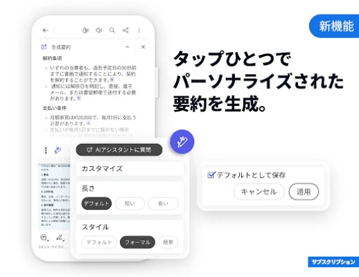 文書の整理と変換も、かつてないほど直感的です。PDF変換ツールを使えば、複数のファイルを結合したり、必要な部分で分割したり、ページを自由に並べ替えたりできます。Microsoft Office形式やGoogleドキュメント、画像ファイルからPDFを作成するのはもちろん、PDFをこれらの形式へ変換することも容易です。重要な情報を保護するためには、PDFファイルの圧縮によるスムーズな共有と、パスワードによる高度なセキュリティ機能をご活用ください。また、移動中でもドキュメントを聞ける読み上げサポートも充実。サブスクリプションを通じて、モバイルとウェブの両方でAdobe Acrobatの全機能を存分にお楽しみいただけます。