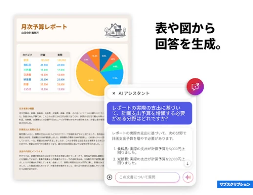 特に注目すべきは、AIがもたらす革新的な共同作業空間「PDFスペース」です。Adobe Acrobat AIアシスタントは、複数のファイルを一元的に扱い、音声またはテキストでの質問に対応。文書内の特定の情報、例えば図表や数値データについても、引用付きで正確な回答を瞬時に提供します。さらに、生成AIによる要約機能でPDFの核心を素早く把握し、メールやブログコンテンツまで生成可能。モバイルから直接PDFのテキストや画像を編集できる機能と合わせ、あなたの生産性を飛躍的に向上させます。(Adobe Acrobat AIアシスタントの一部機能は有料プランでの提供となり、無料体験には回数制限があります。)