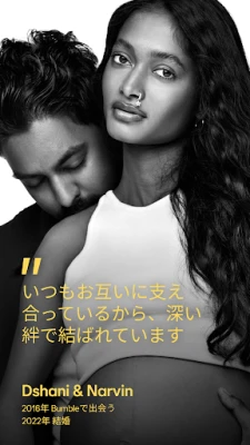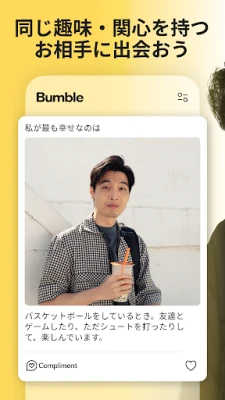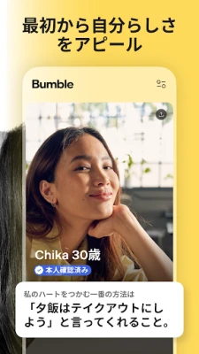 人との出会いは、人生を豊かに彩る特別な物語の始まりです。Bumbleは、単なるマッチングを超え、誰もが安心して、そして自信を持って、心に響くつながりを見つけられる場所を提供します。真剣な交際を望む方も、カジュアルな出会いを求める方も、あるいは友情を育みたい方も、Bumbleでは尊重と信頼を基盤とした環境で、あなたらしい関係を築くことができます。私たちは、あなたが自分らしく輝き、本当に求めている出会いへと導くことを何よりも大切にしています。