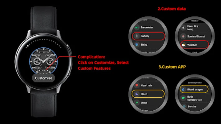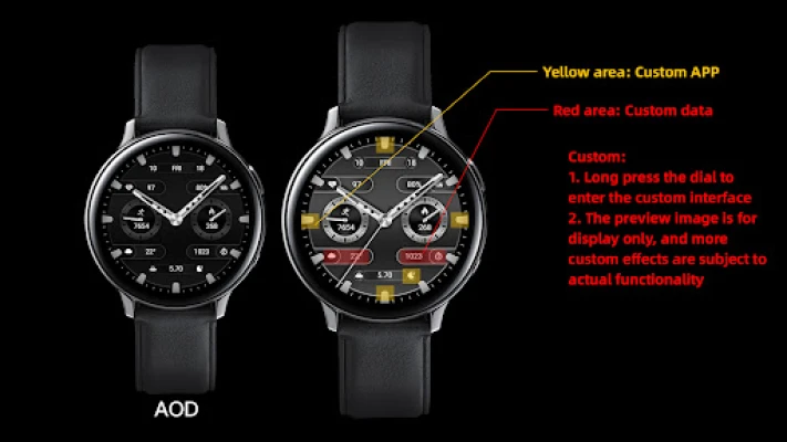 Wear OS 1対応のウォッチフェイス。日付、週、心拍数、バッテリー、歩数、カロリー、距離など、多様な情報を表示。外側や下部にカスタムアプリを設定し、複数の領域を自由にカスタマイズ可能。Pixel Watch、Galaxy Watch 4/5/6/7以降のデバイスに互換。