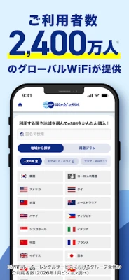 海外旅行や海外出張時の通信は「World eSIM」にお任せください。200以上の国と地域をカバーし、面倒な現地SIMの購入は不要。到着後すぐに安定した高速通信を利用でき、あなたの旅をより快適でスムーズなものにします。